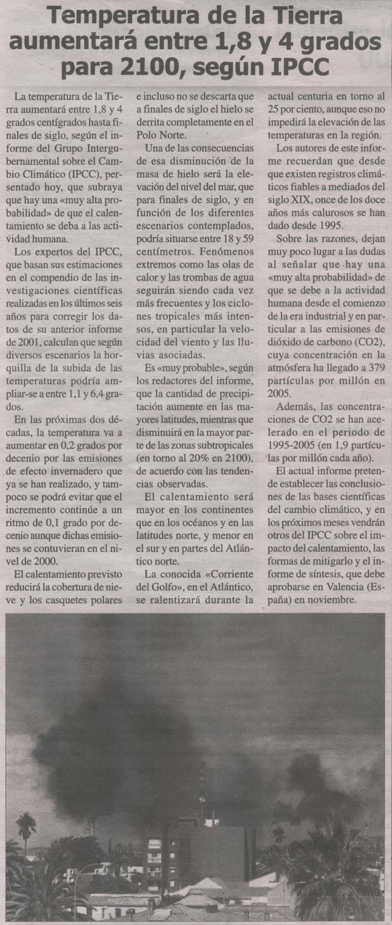 Título : Temperatura de la tierra aumentará entre 1,8 y 4 grados para 2100, según ipcc